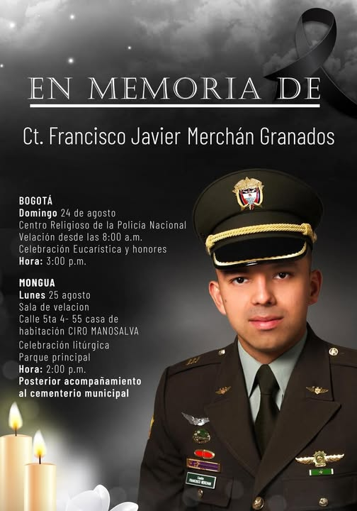 Con profundo respeto y gratitud por su vida de servicio, la familia Merchán, la Policía Nacional y el curso 101 de ofíciales, invitan a acompañar las honras fúnebres del Capitán Francisco Merchán, quien en vida se distinguió por su compromiso, honor y vocación institucional .