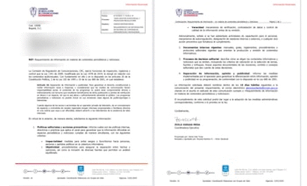 La CRC envió una carta en la que solicita a los medios que informen cuáles son sus políticas internas, directrices y prácticas para garantizar imparcialidad, objetividad y veracidad en todas las emisiones informativas.