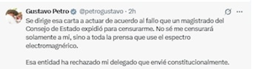 Incluso, ante las denuncias de posible censura, el presidente Petro contestó un mensaje sobre el tema en el que dijo que era una medida en los mismos términos en los que el Consejo de Estado falló para delimitar sus alocuciones presidenciales.