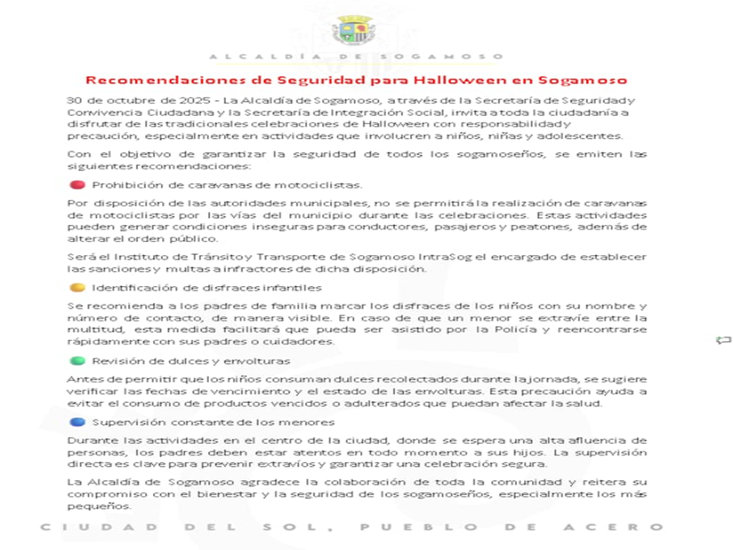 Asimismo, las autoridades recomendaron a los padres identificar los disfraces infantiles con el nombre y número de contacto del menor, revisar cuidadosamente los dulces recolectados y mantener una supervisión constante de los niños en lugares concurridos. “La seguridad de nuestros pequeños es prioridad; queremos que las familias celebren con alegría, pero también con responsabilidad”, señaló la Alcaldía en un comunicado. La administración agradeció la colaboración ciudadana y reafirmó su compromiso con el bienestar y la convivencia en el municipio.