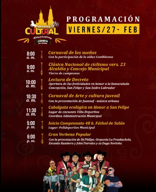 Durante el evento organizado por la administración del alcalde Juan Carlos Sarmiento, residentes y visitantes, podrán disfrutar, el viernes 27, del del carnaval de los sueños, la Vigésimo Tercera Clásica Nacional de Ciclismo, cabalgata ecológica en honor a San Felipe, el inicio del campeonato de fútbol de salón y la primera gran verbena popular con la presentación del DJ Philipe, orquesta la Frankachela, Encanto Rumbero y John Parrales y su Daga Norteña.