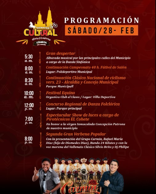 De la misma forma, el sábado 28 de febrero, contempla la continuación del campeonato de fútsal, clásica de ciclismo, lo mismlo que la realización del festival equino, concurso regional de danza folclórica, sspectacular show de luces en honor la Virgen de la Inmaculada y la segunda verbena popular, con participación del Grupo Carmín, Rafael María Díaz, Banda 24 Kilates y el vallenato de Silvio Brito.